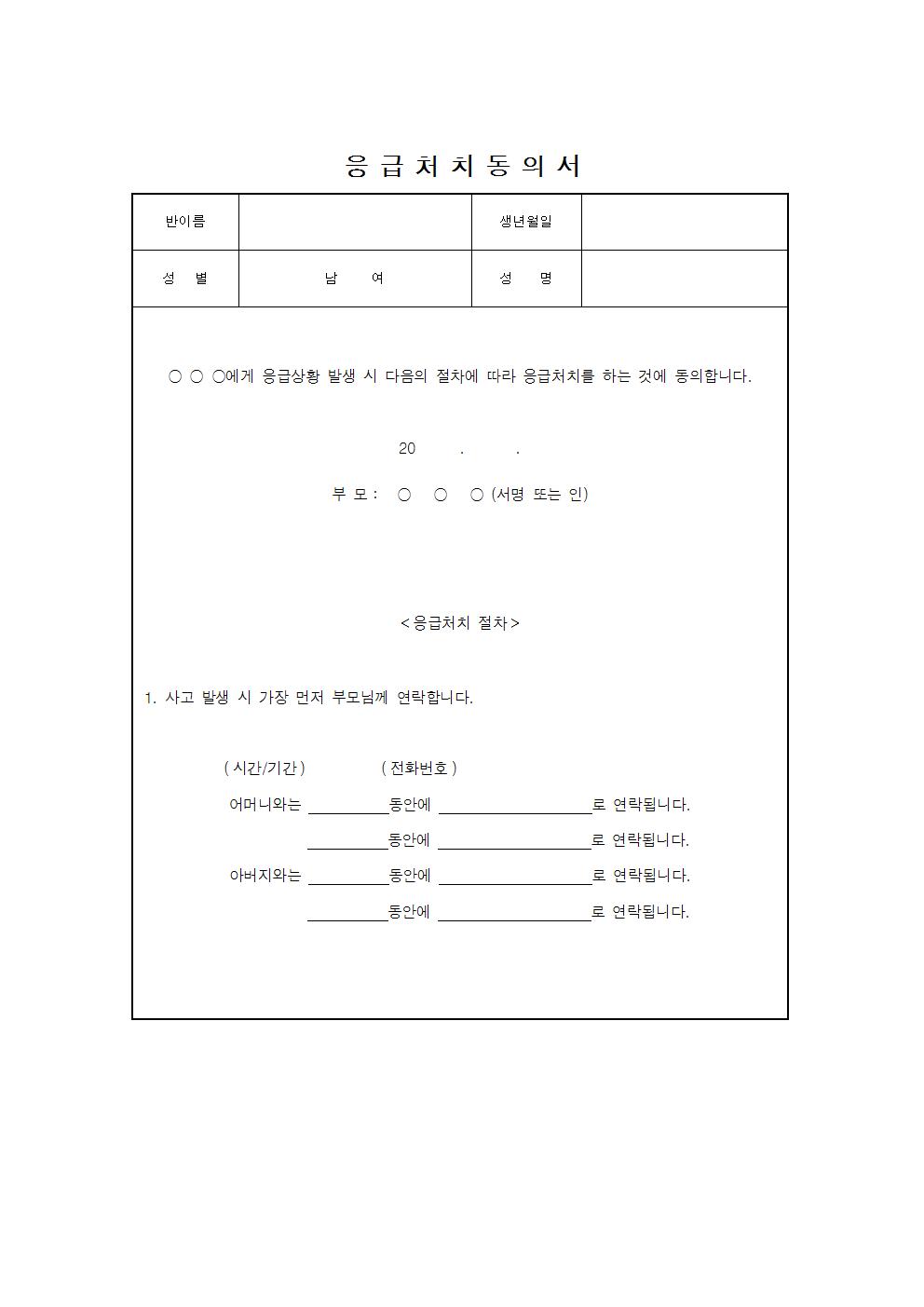 첨부파일 : 응급처치동의서001.jpg (61 kb) 응급처치동의서002.jpg (70 kb) 응급처치동의서.hwp (14 kb)