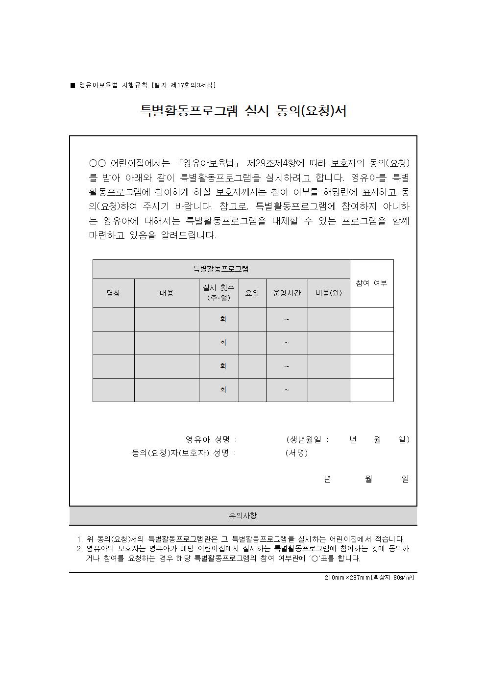 첨부파일 : 특별활동프로그램실시동의서.hwp (14 kb) 특별활동프로그램실시동의서001.jpg (118 kb)