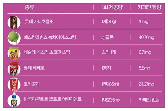 먹는 간식류에는 대부분 명확하게 표기되지 않기 때문에 카페인 함량이 높은 제품은 부모가 미리 숙지해