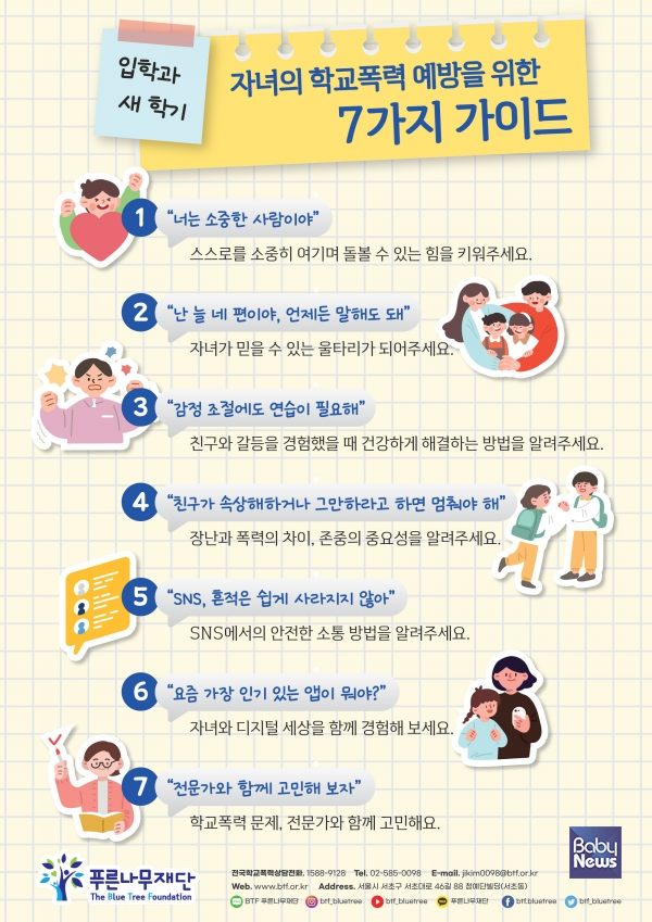 이를 위한 해법으로 푸른나무재단은 ‘입학과 새 학기, 자녀의 학교폭력 예방을 위한 7가지 가이드’를 제안했다.