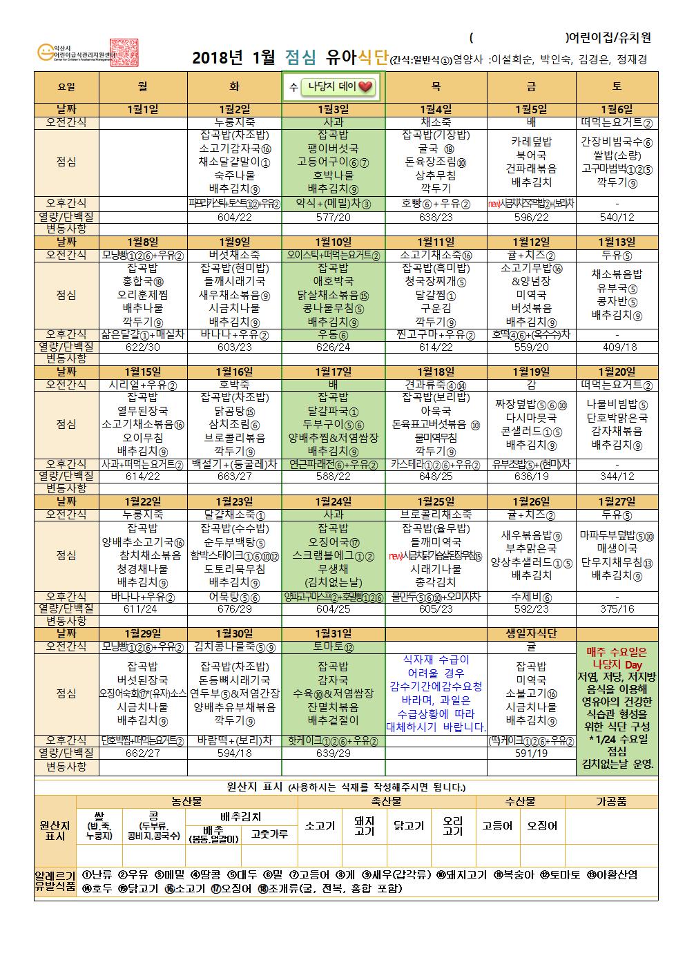 첨부파일 : 2018년1월+점심+유아+일반식.hwp (49 kb) 2018년1월+점심+유아+일반식001.jpg (342 kb)