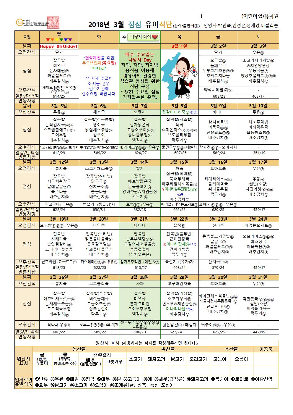 첨부파일 : 2018년3월+점심+유아+일반식.hwp (112 kb) 2018년3월+점심+유아+일반식001.jpg (322 kb)