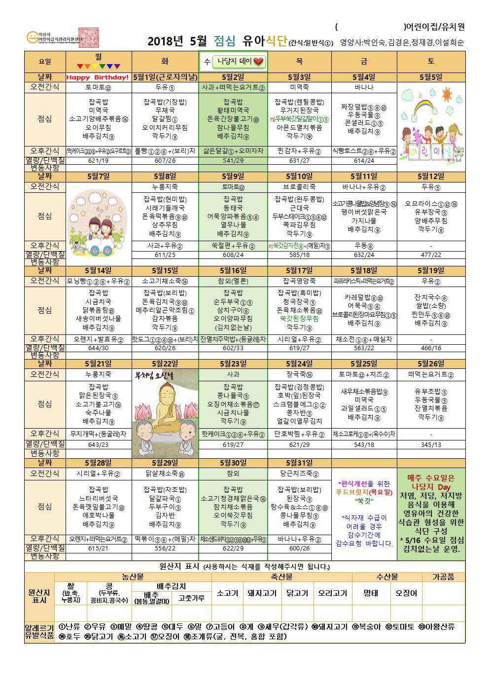 첨부파일 : 2018년5월+점심+유아+일반식001.jpg (323 kb) 2018년5월+점심+유아+일반식.hwp (330 kb)