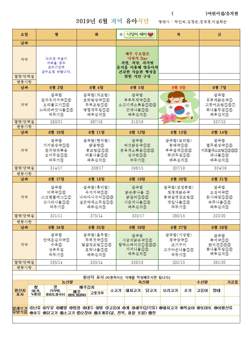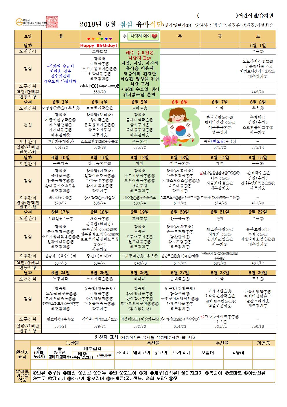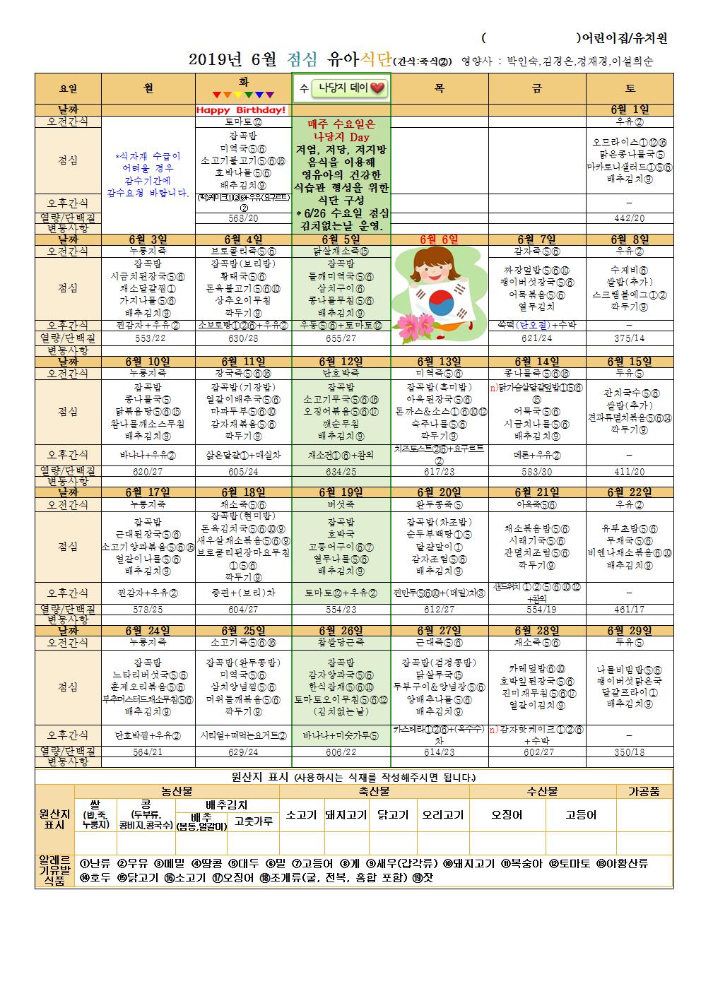 첨부파일 : 6월유아식단.hwp (156 kb) 6월유아식단001.jpg (318 kb) 6월유아식단002.jpg (311 kb) 6월유아식단003.jpg (250 kb)