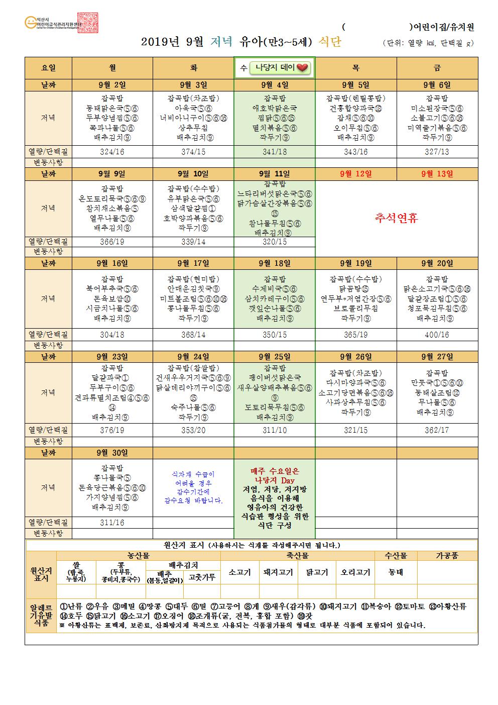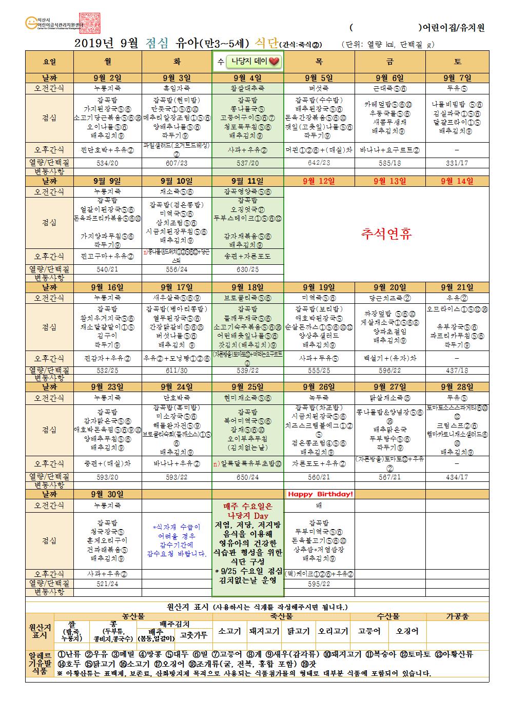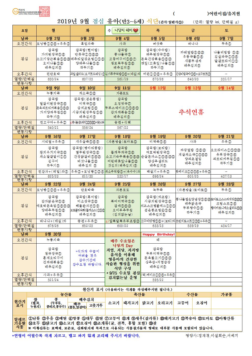 2019년 9월 식단