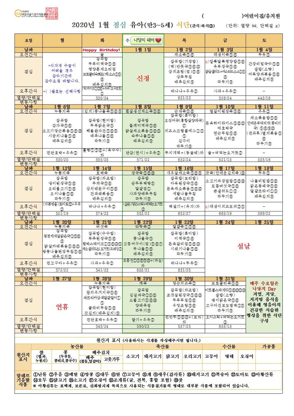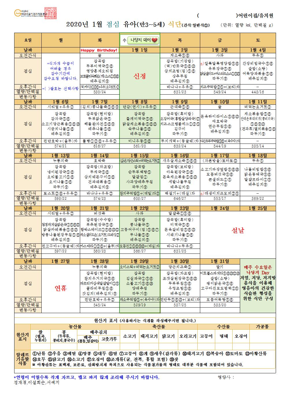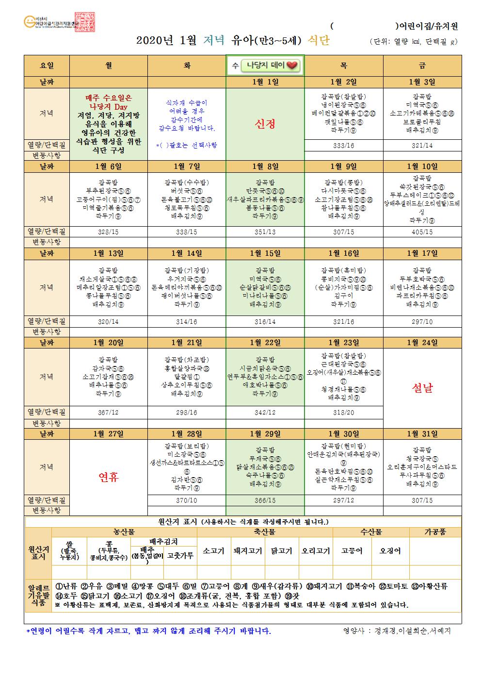 첨부파일 : 1월유아식단.hwp (64 kb) 1월유아식단001.jpg (326 kb) 1월유아식단002.jpg (314 kb) 1월유아식단003.jpg (262 kb)