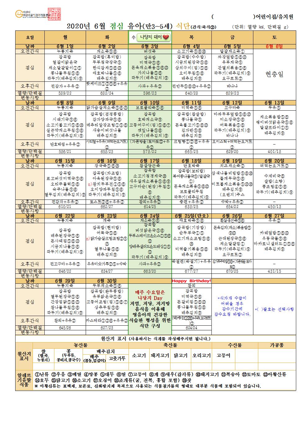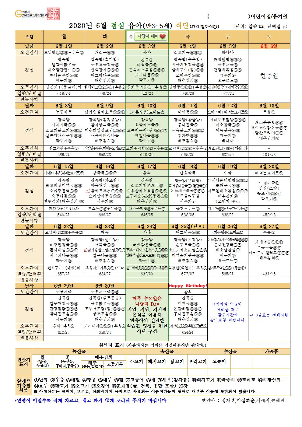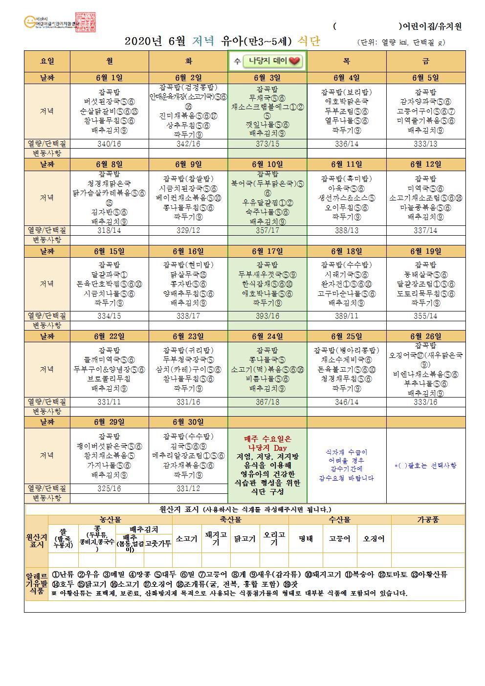 첨부파일 : 6월유아식단.hwp (64 kb) 6월유아식단001.jpg (341 kb) 6월유아식단002.jpg (328 kb) 6월유아식단003.jpg (276 kb)