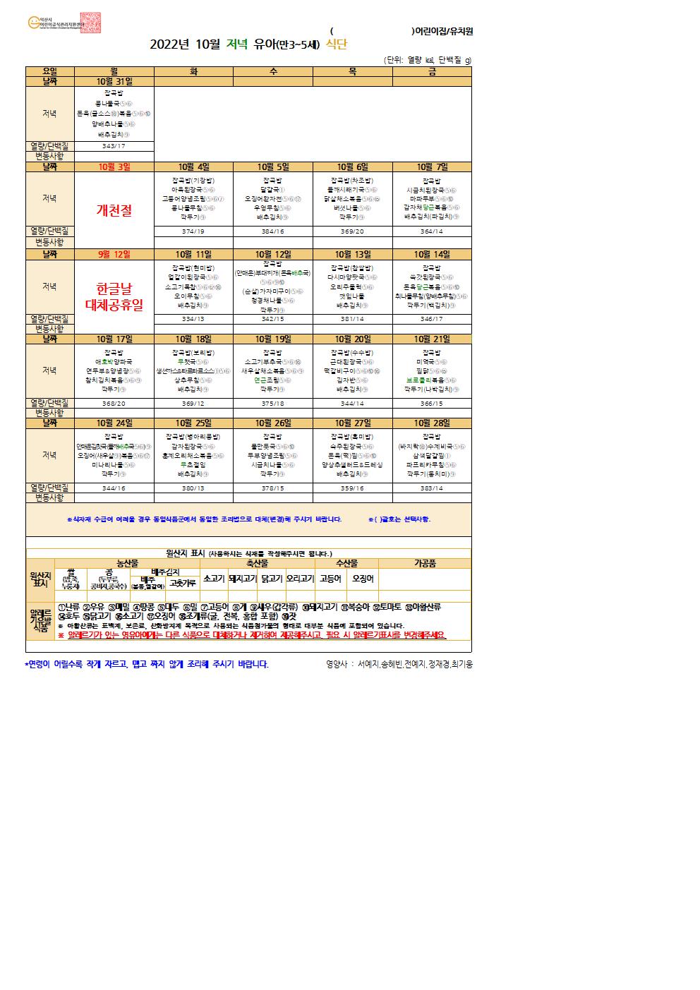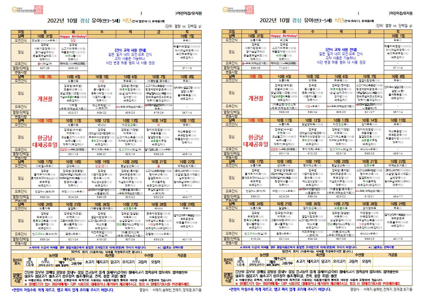 첨부파일 : 2022년10월유아식단.hwp (192 kb) 2022년10월유아식단001.jpg (394 kb) 2022년10월유아식단002.jpg (162 kb)
