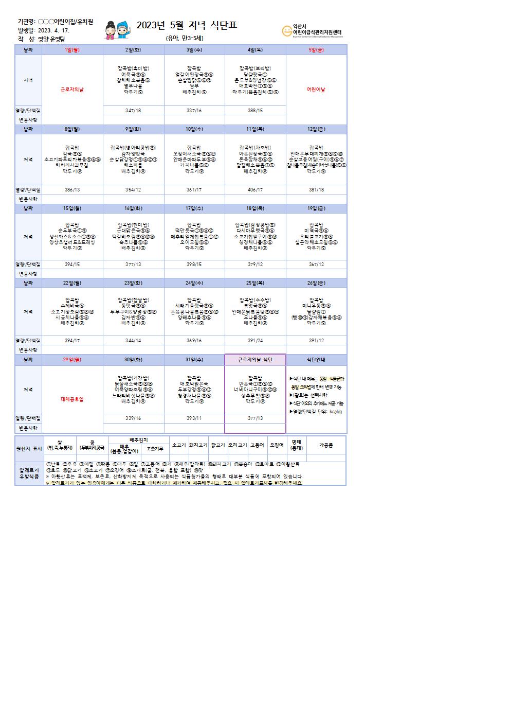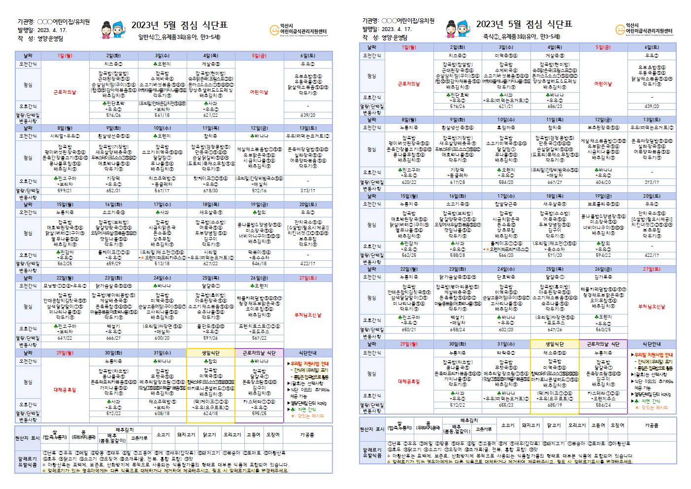 첨부파일 : 2023년5월유아식단.hwp (276 kb) 2023년5월유아식단001.jpg (351 kb) 2023년5월유아식단002.jpg (143 kb)