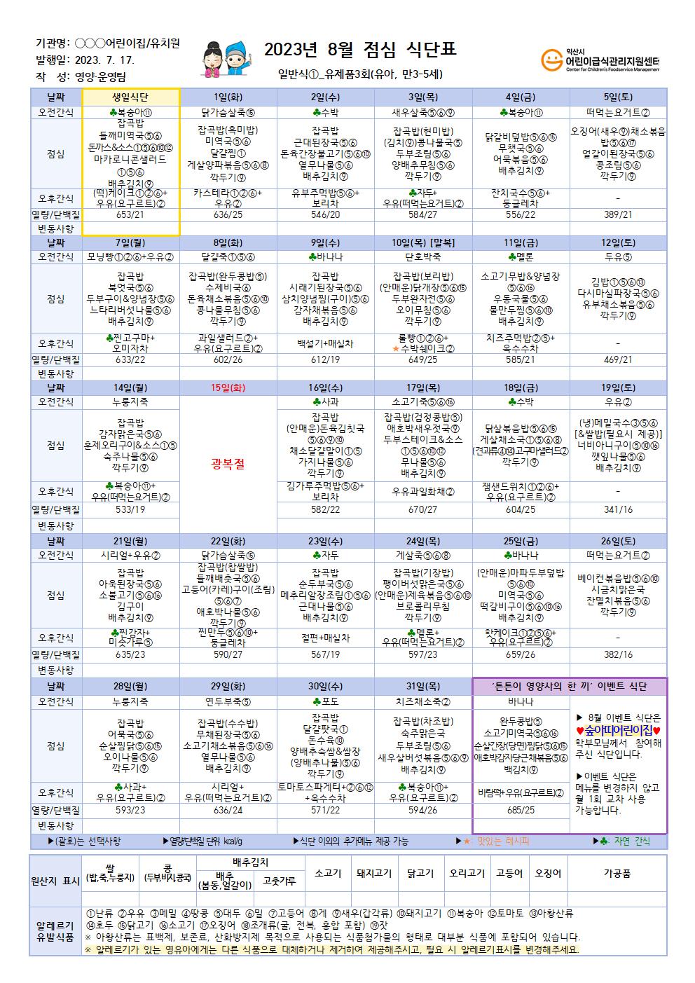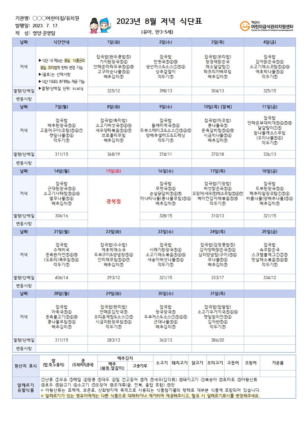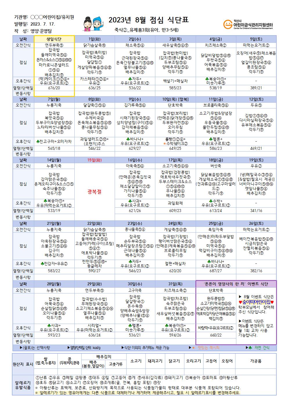 홈 > 어린이집지원 > 월별식단 > 유아식단