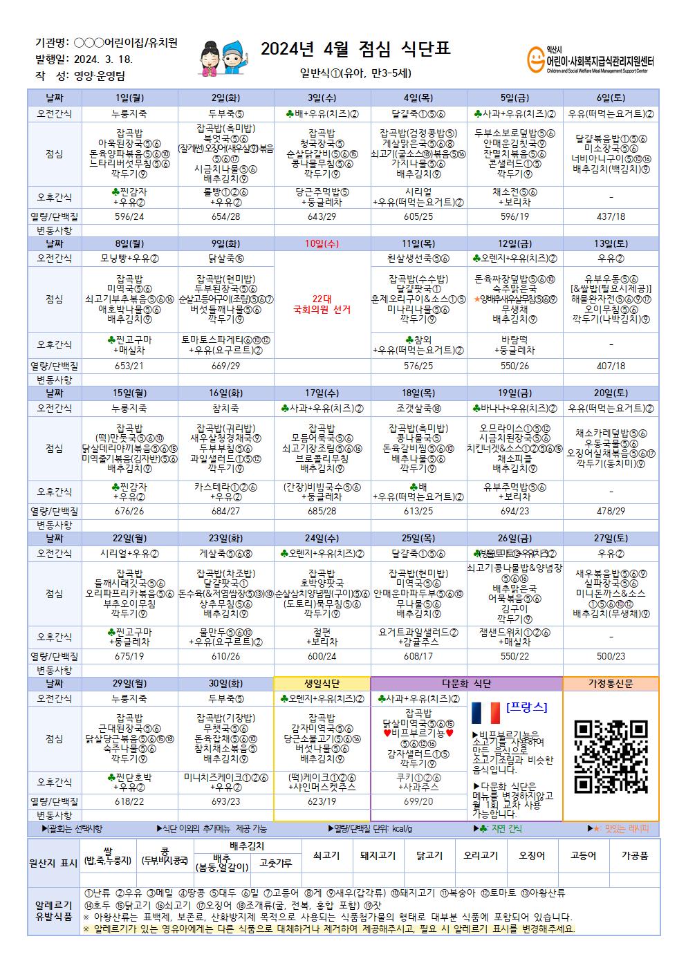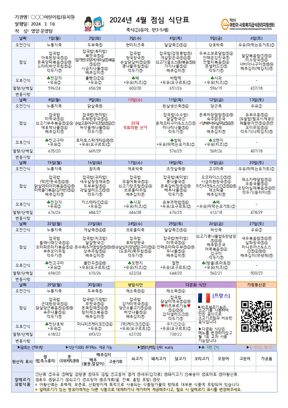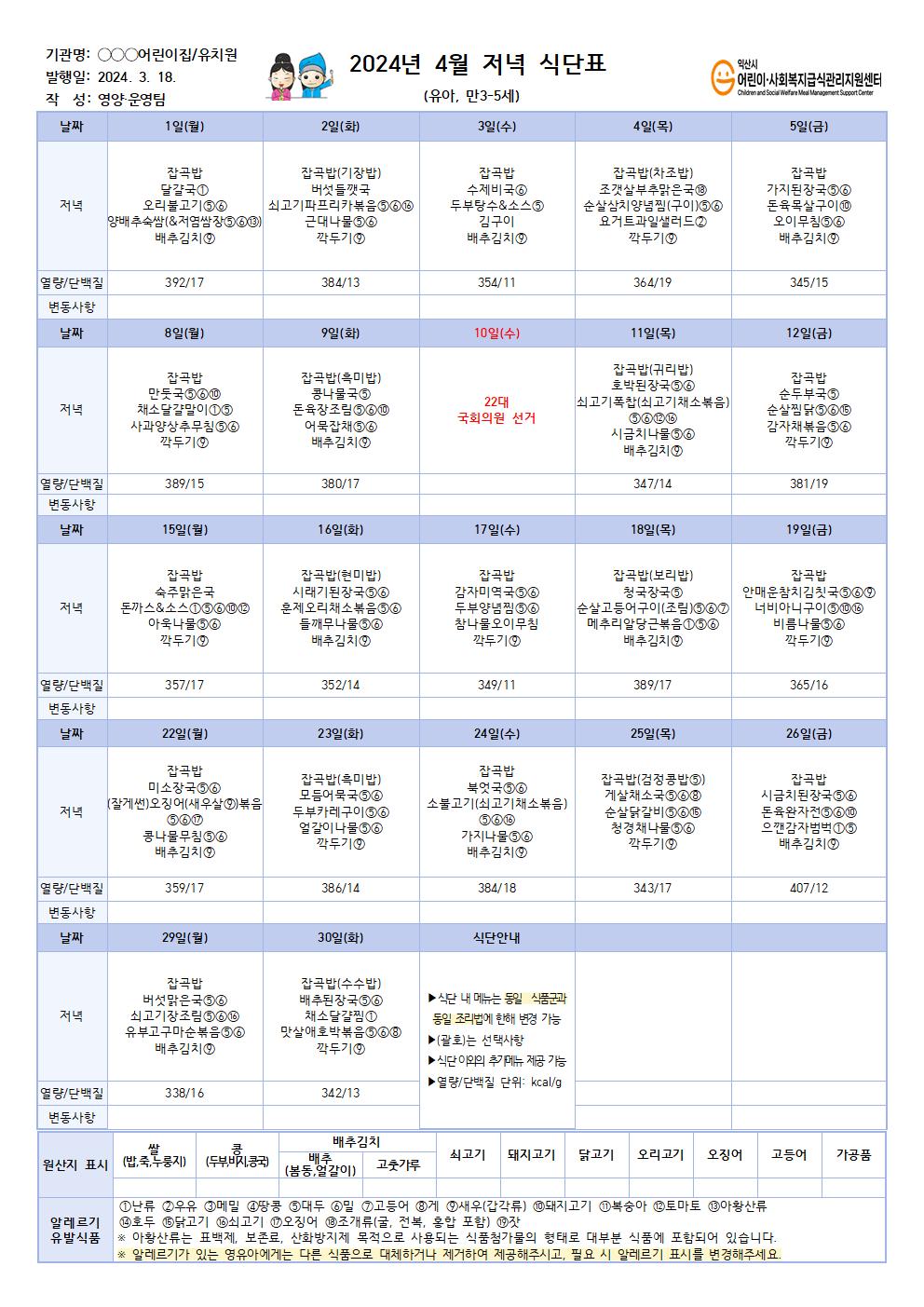 홈 > 어린이집지원 > 월별식단 > 유아식단