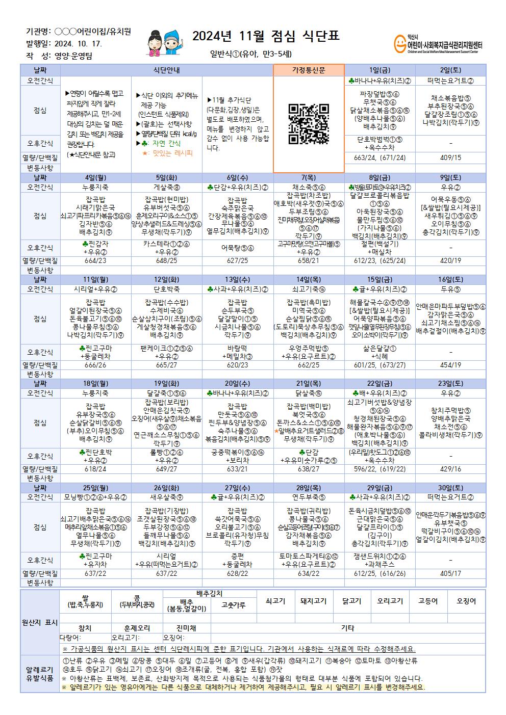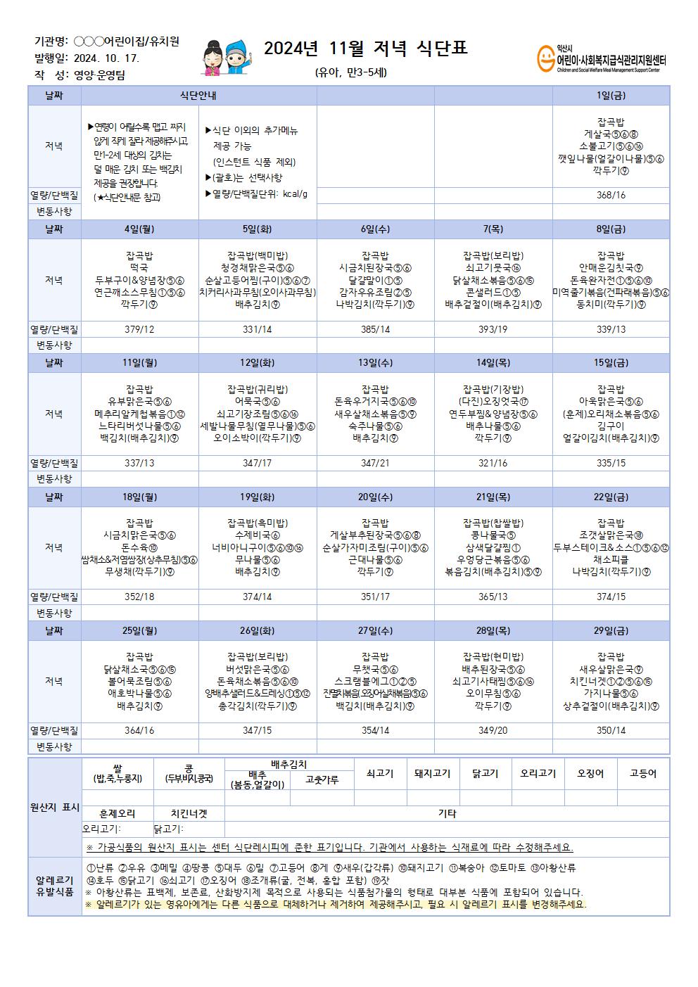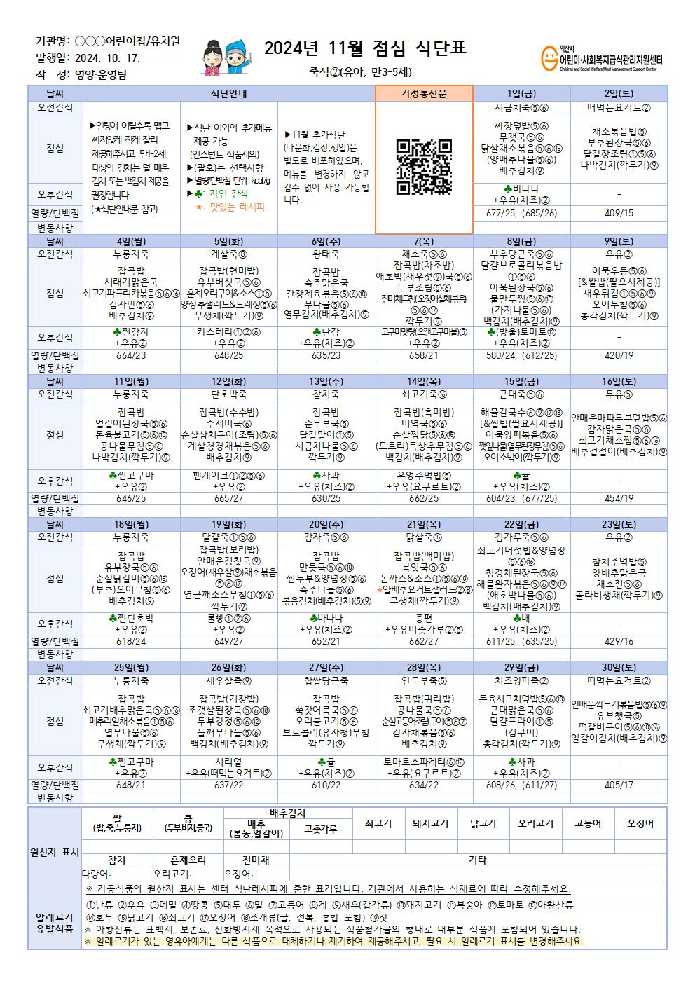 홈 > 어린이집지원 > 월별식단 > 유아식단
