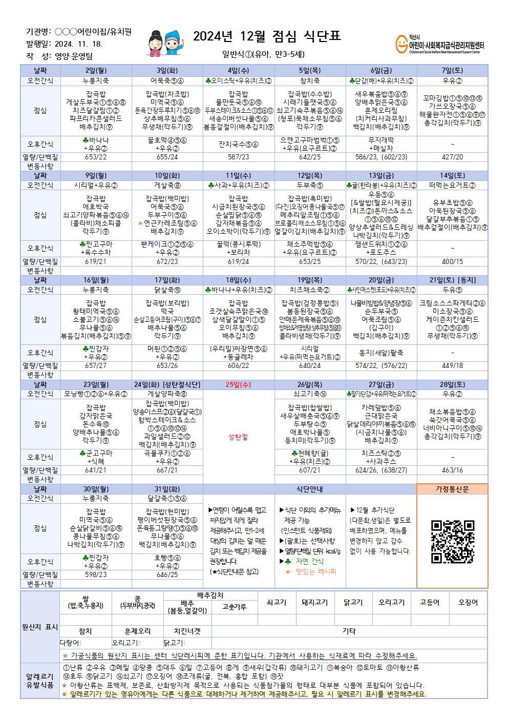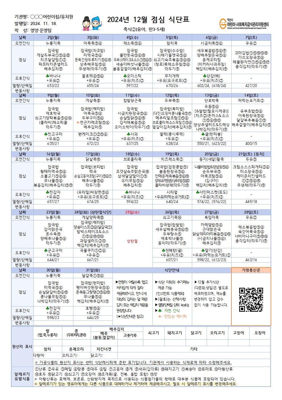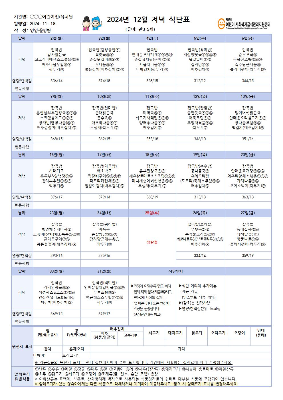 홈 > 어린이집지원 > 월별식단 > 유아식단