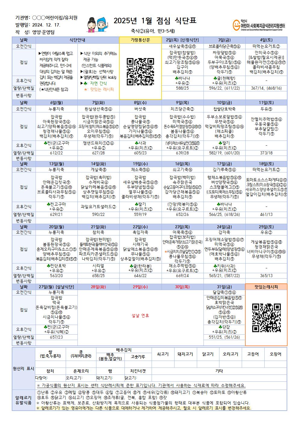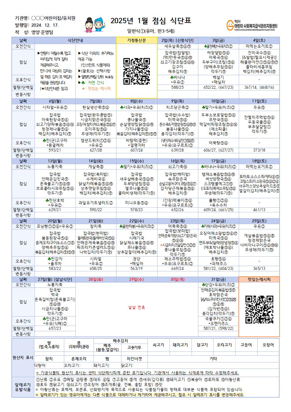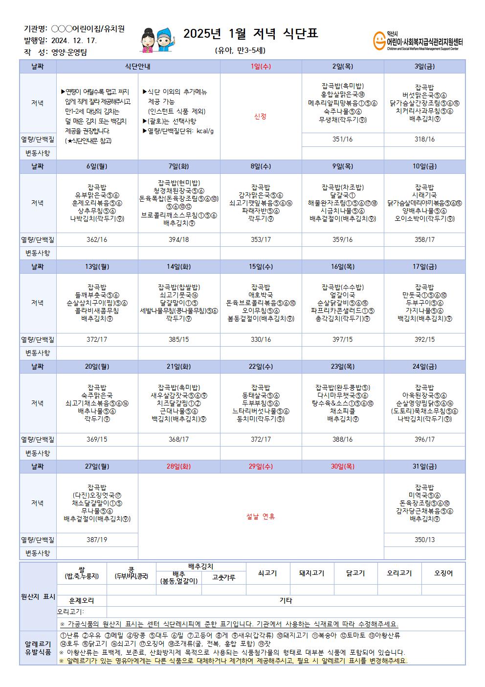 홈 > 어린이집지원 > 월별식단 > 유아식단