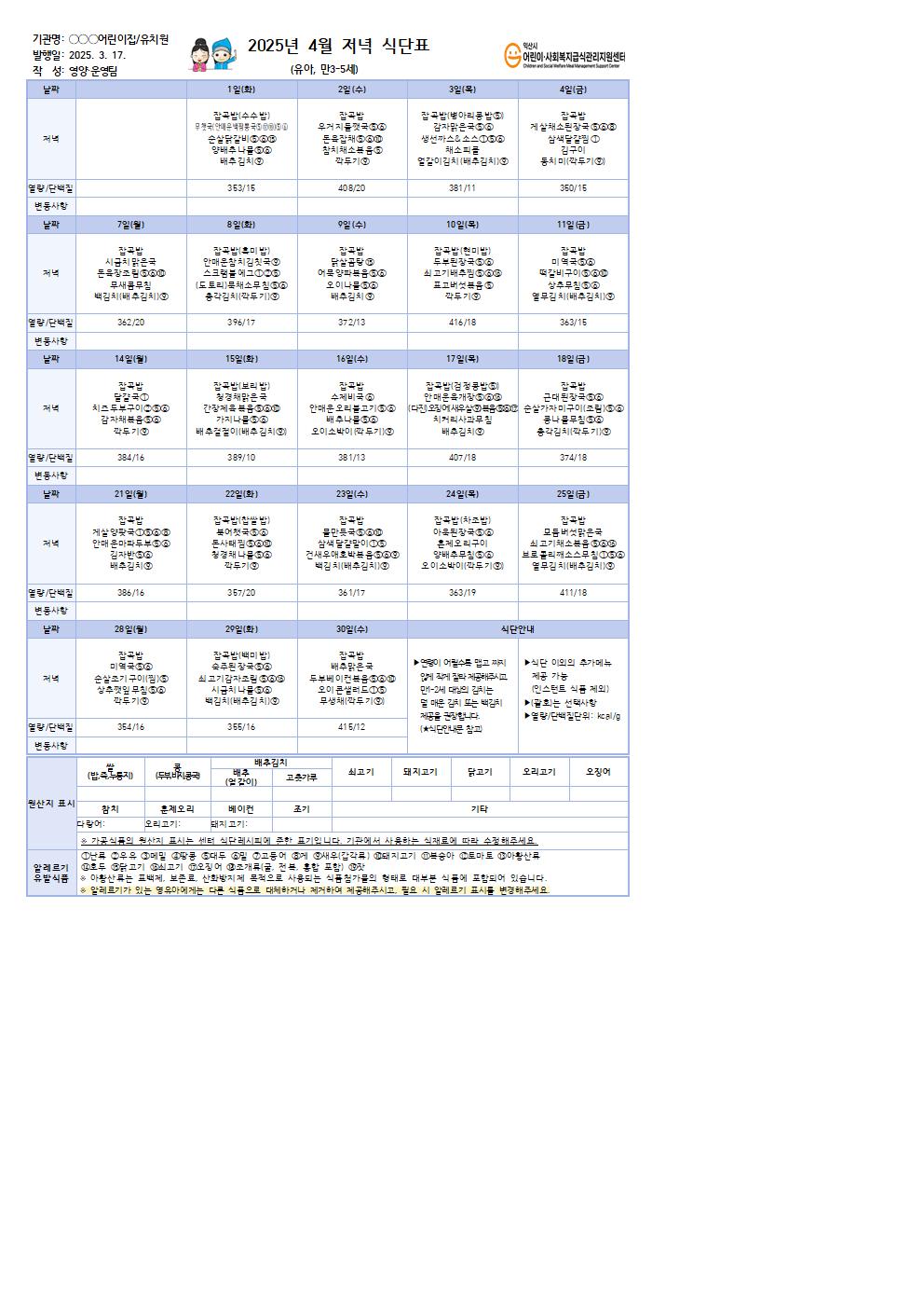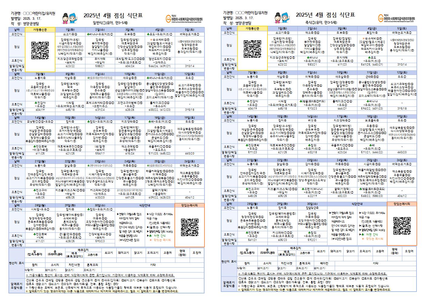 첨부파일 : 2025년4월유아식단.hwp (270 kb) 2025년4월유아식단001.jpg (392 kb) 2025년4월유아식단002.jpg (161 kb)
