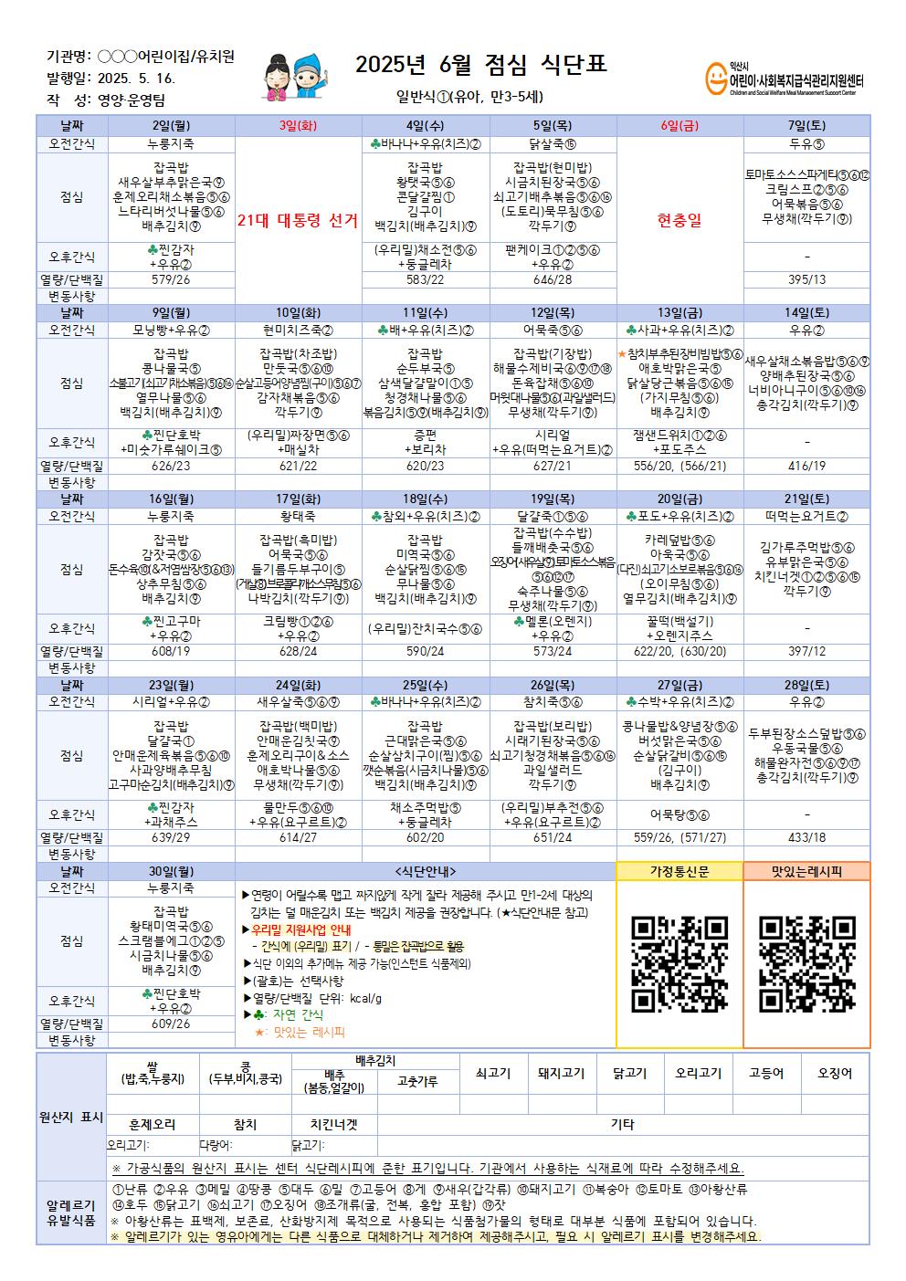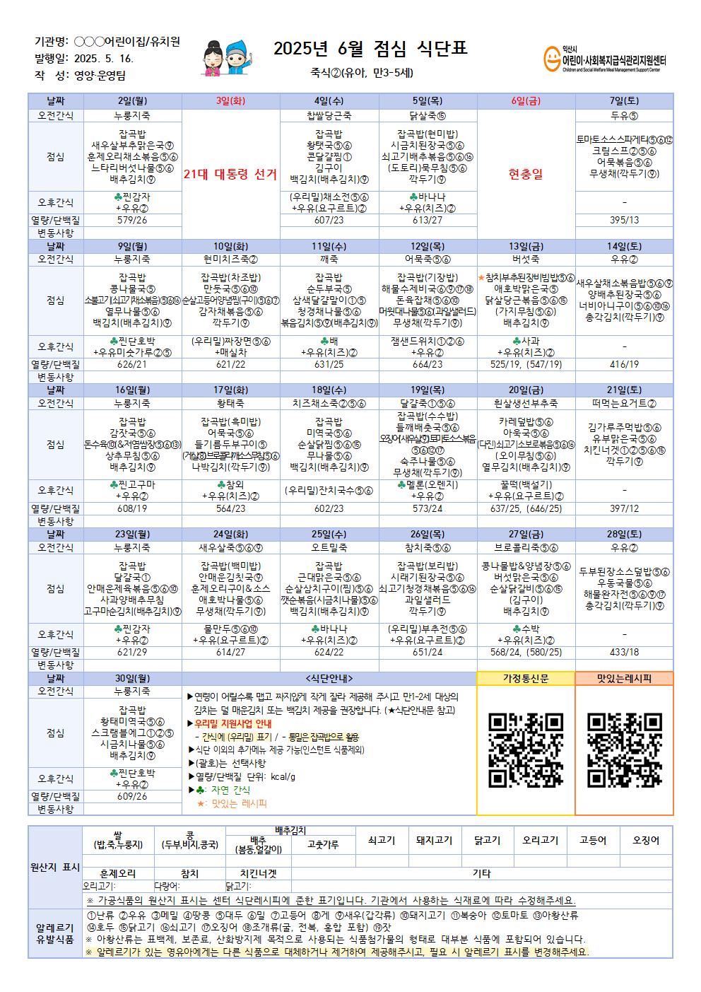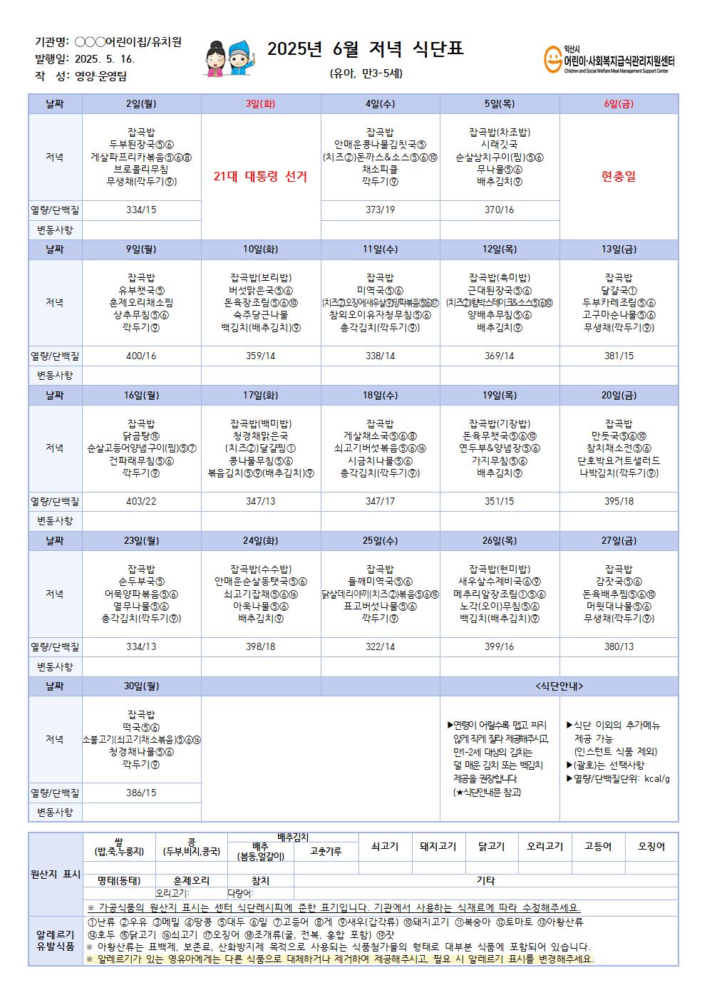 홈 > 어린이집지원 > 월별식단 > 유아식단