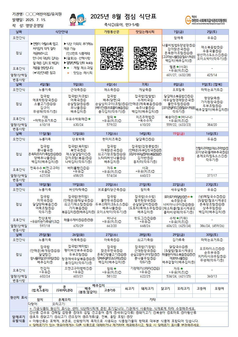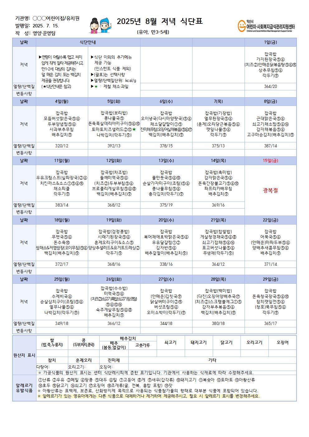 홈 > 어린이집지원 > 월별식단 > 유아식단