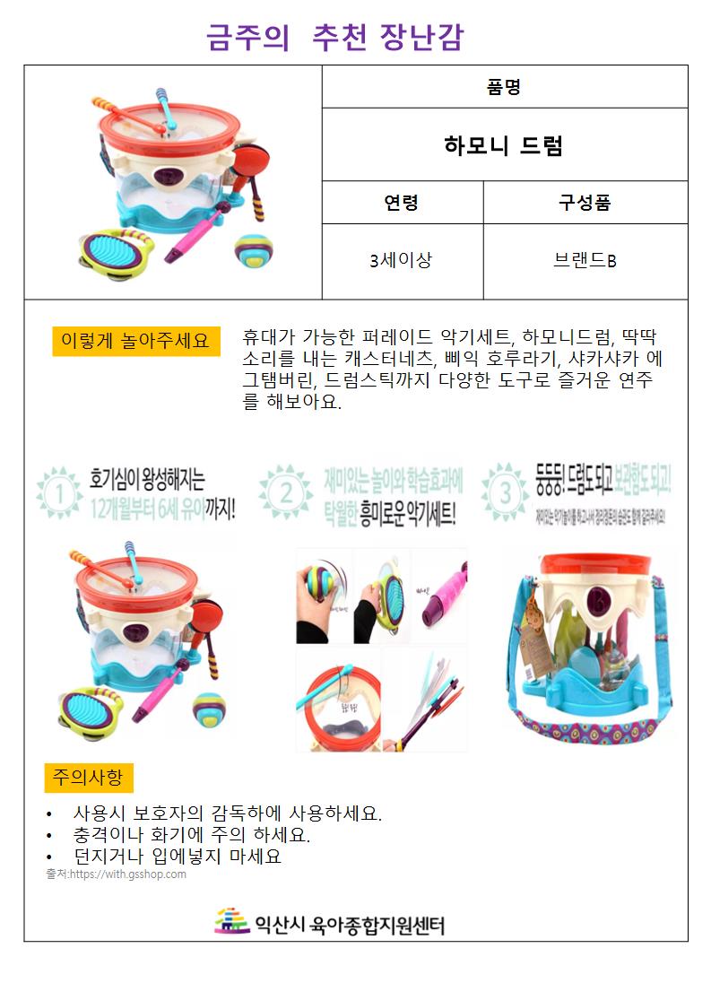 휴대가 가능한 퍼레이드 악기세트, 하모니드럼, 딱딱소리를 내는 캐스터네츠, 삐익 호루라기, 샤카샤카 에그탬버린, 드럼스틱까지 다양한 도구로 즐거운 연주를 해보아요.